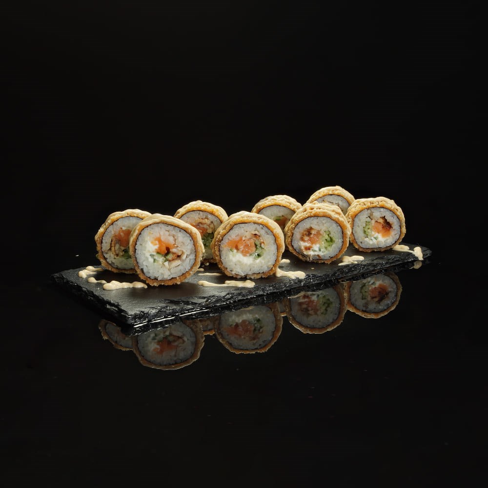 Состав: рис, водоросли нори, сыр творожный, огурец, лосось, унаги*, икра масаго, кляр, сухари панировочные, соус тануки
