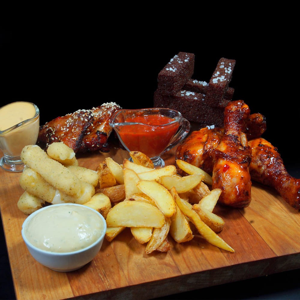 Состав: гренки бородинские с чесноком, крылья классические, куриные голени терияки, сырные палочки, картофель дольки, соус чесночный, соус нирвана, соус сацебели