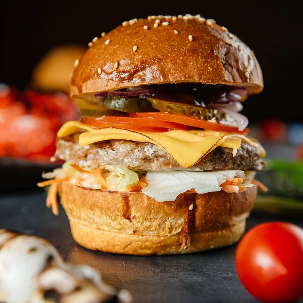 Состав: булочка с кунжутом, котлета из свинины, сыр чеддер, салат айсберг, соус BBQ, фирменный соус Огонек, лук красный, помидор свежий, огурец маринованный, салат клоу-слоу