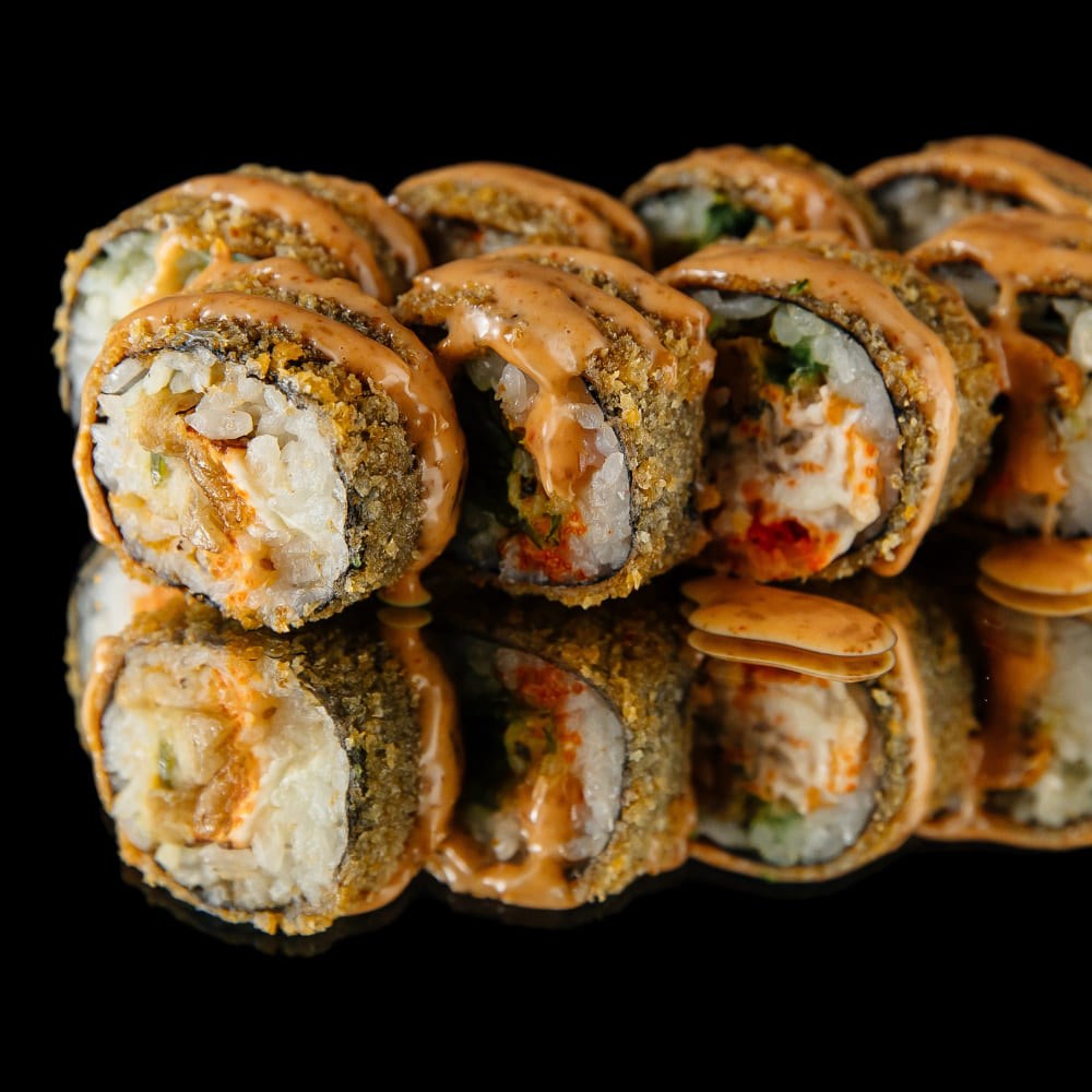 Состав: рис, нори, сыр творожный, водоросли чука, мидии, икар масаго, кларий, соус шичими