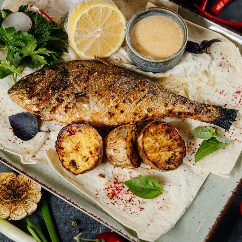 Состав: очень популярная рыба народов Средиземноморья, он же «Морской карась» преимущественно это диетическая рыба. Подается с печеным картофелем, лавашем, соусом Тар-тар.