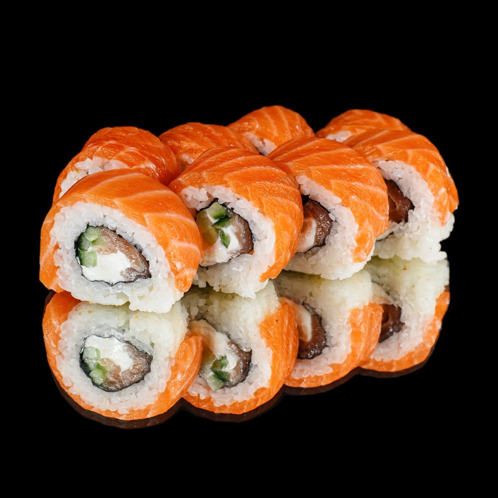 Состав: рис, нори, сыр творожный, лосось, огурец