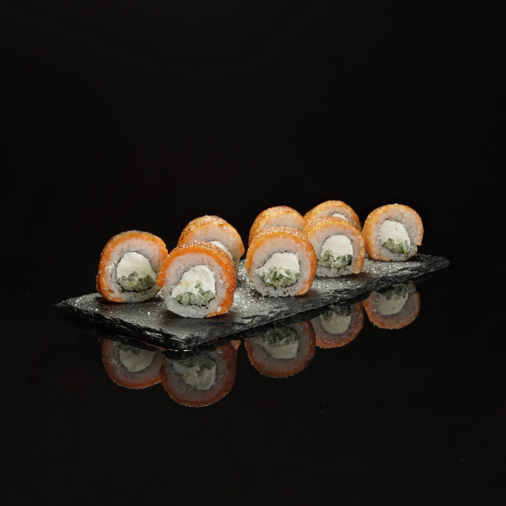 Состав: рис, водоросли нори, сыр творожный, огурец, лосось, сахар тростниковый, соль морская