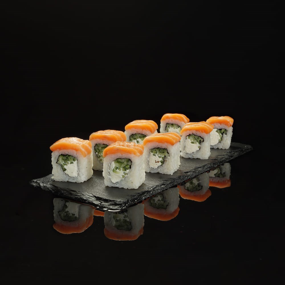 Состав: рис, водоросли нори, сыр творожный, огурец, лосось