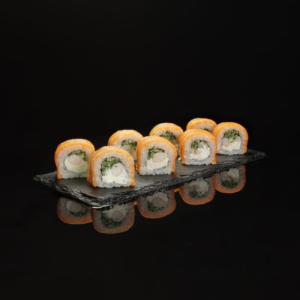 Состав: рис, водоросли нори, сыр творожный, огурец, креветка отварная, лосось