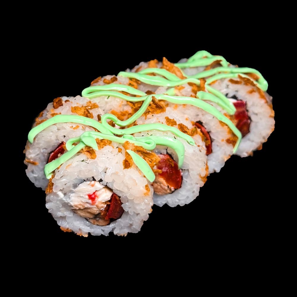 Состав: рис, водоросли нори, сыр творожный, лук жареный, соус шрирача, лосось филе
