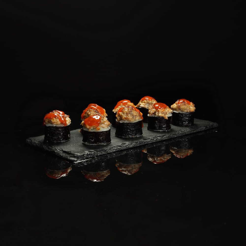 Состав: рис, водоросли нори, сыр творожный, огурец, лосось терияки, майонез, соус шрирача