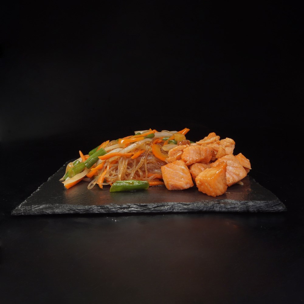 Состав: масло подсолнечное, филе лосося, морковь, лук репчатый, фасоль стручковая, перец болгарский, бульон суимоно, соевый соус, лапша фунчоза, соус на выбор, кунжут белый