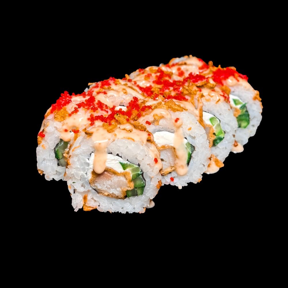 Состав: рис, нори, креветка темпура, огурец, краб, соус спайси, соус унаги, масаго