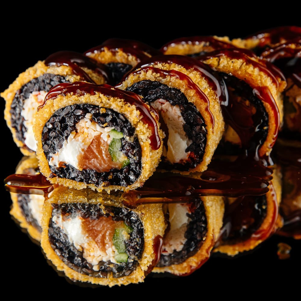 Состав: рис чёрный, нори, сыр творожный, масаго, лосось, краб, огурец, унаги