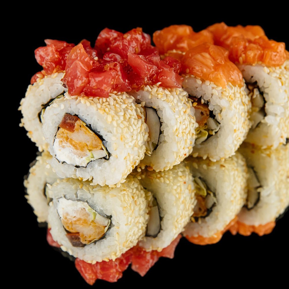 Состав: рис, нори, креветка темпура, пекинка, помидор, сыр творожный, кунжут, лосось филе, манго-чили, тунец, чили сладкий