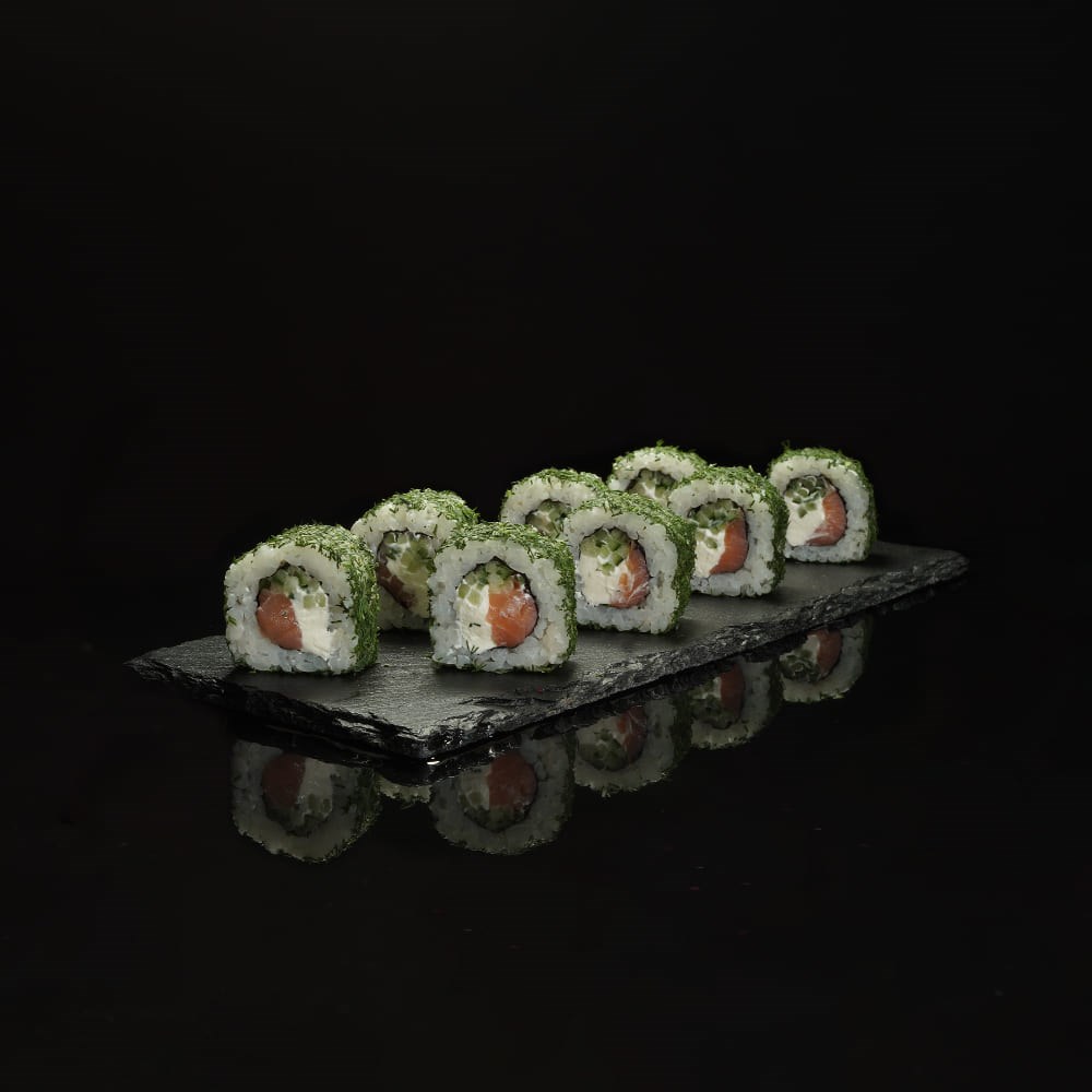 Состав: рис, водоросли нори, сыр творожный, огурец, лосось копченый, укроп