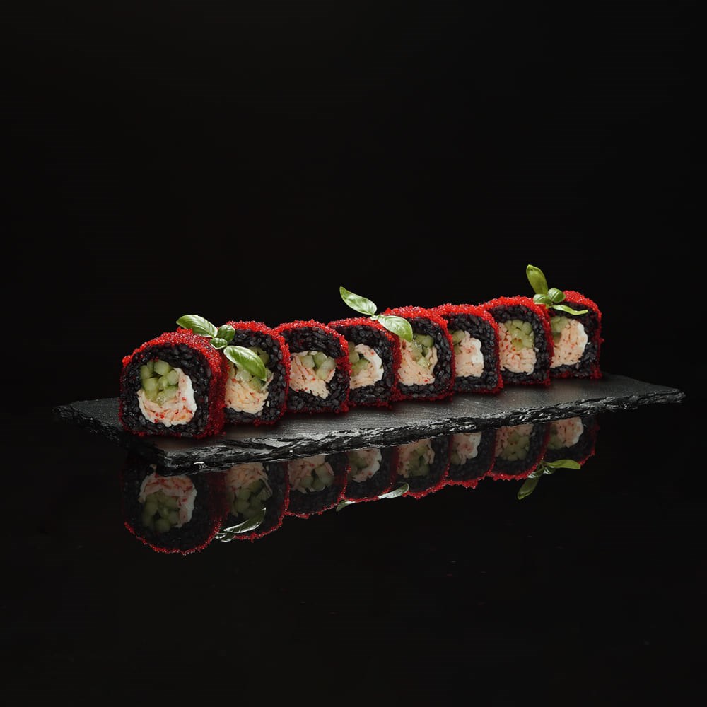 Состав: нори, рис для суши (черный), снежный краб, огурец, сыр творожный, масаго красная