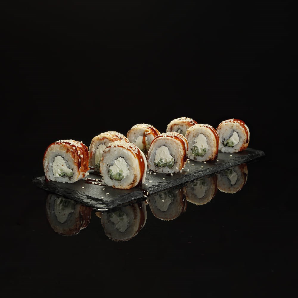 Состав: рис, водоросли нори, сыр творожный, огурец, угорь, соус унаги, кунжут
