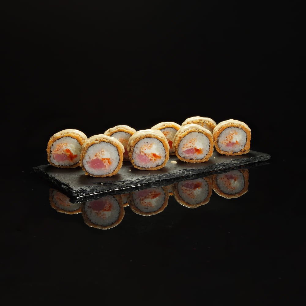 Состав: рис, водоросли нори, сыр творожный, икра масаго, снежный краб, тунец, кляр, сухари панировочные, соус тануки