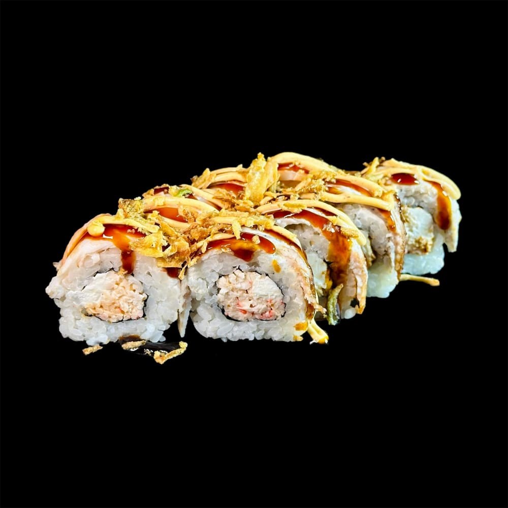 Состав: рис, нори, сыр, кимчи, краб, угорь, креветка, унаги, спайси, лук фри.