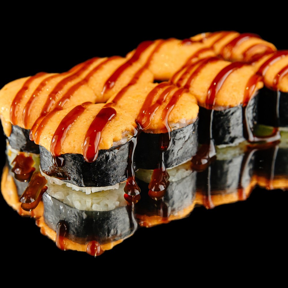 Состав: рис, водоросли нори, сыр творожный, манго, лосось, сырный соус для запекания, соус унаги
