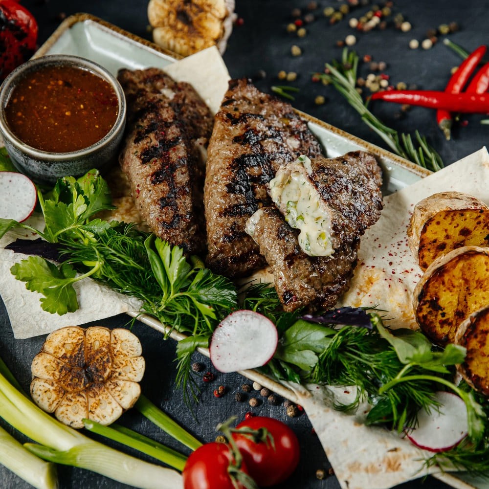 Состав: подается с печеным картофелем, лавашем, маринованным луком, соусом Сацебели.