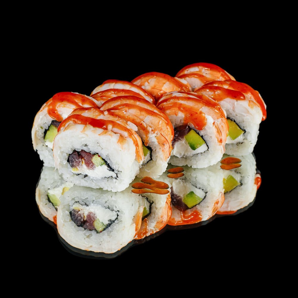 Состав: рис, нори, сыр творожный, авокадо, тунец, креветки вареные, соус Шрирача