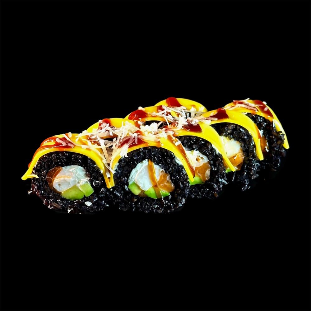 Состав: рис черный, нори, сыр, креветка, лосось, авокадо, чеддер, унаги, пармезан.