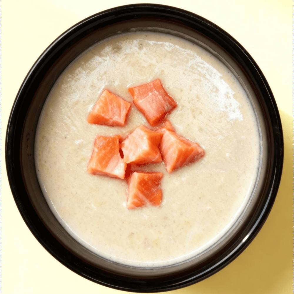 Состав: картофель , кукуруза сладкая, филе лосося , рыбный бульон, молоко, сливки , чиабатта