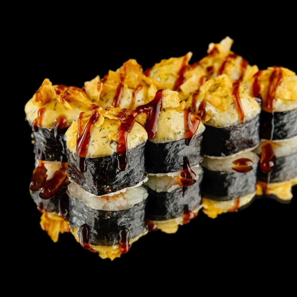 Состав: рис, нори, сыр творожный, снежный краб, чесночный соус, соус унаги, чипсы лейс с крабом