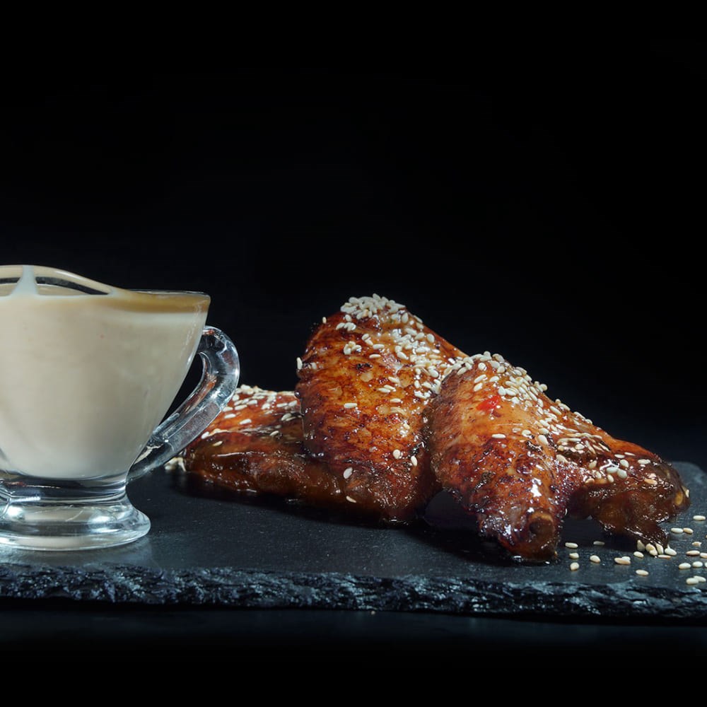 Состав: куриные крылышки сувид, соус терияки, сладкий чили, чесночное масло с пармезаном, кунжут