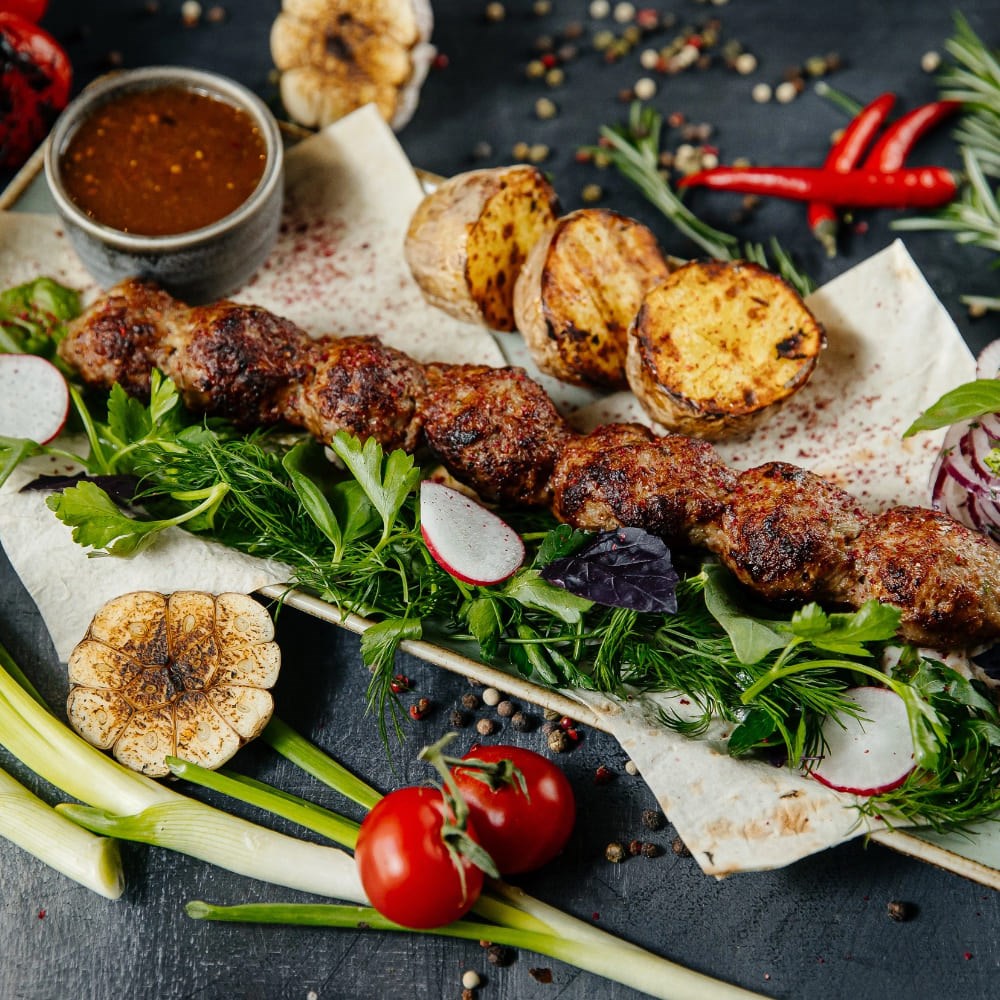Состав: подается с печеным картофелем, лавашем, маринованным луком, соусом Сацебели.