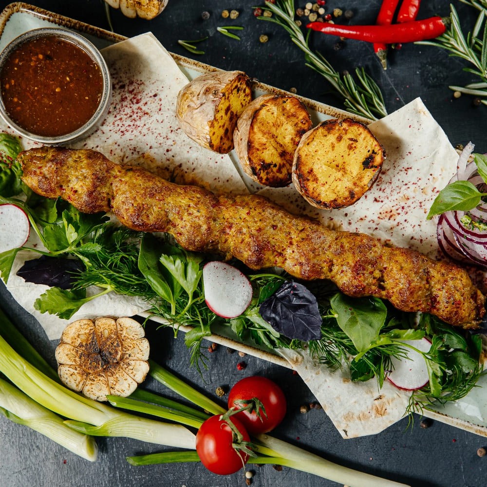 Состав: люля-Кебаб из курицы, люля- Кебаб из индейки с сыром, люля-Кебаб из баранины, кюфта из телятины с сыром, купаты из телятины, купаты из свинины, печеный картофель, лаваш, лук маринованный, соуса