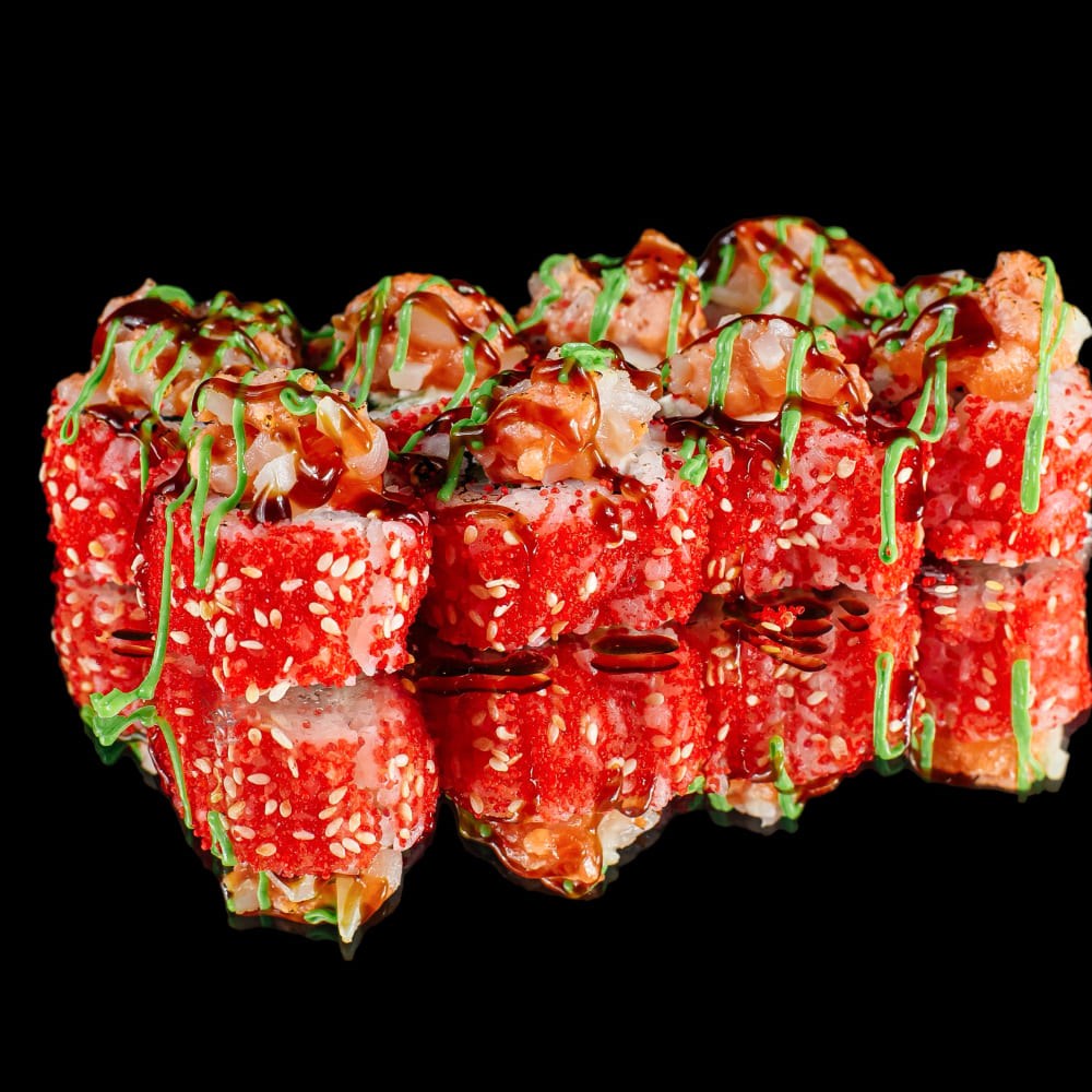 Состав: рис, нори, сыр творожный, огурец, масаго, кунжут, лосось, гребешок, соус Васаби, соус Унаги