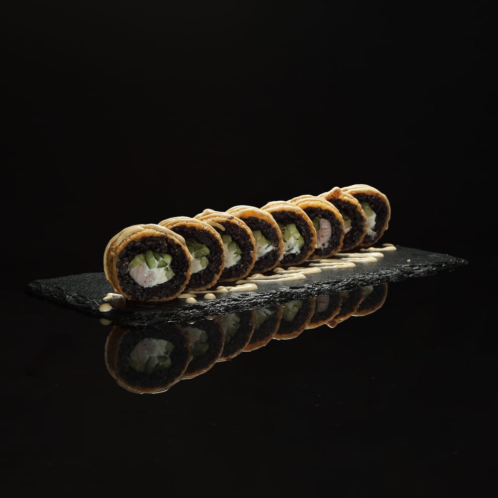 Состав: нори, рис для суши (черный), тунец, огурец, сыр творожный, масаго оранжевая, кляр, сухари панировочные, соус тануки