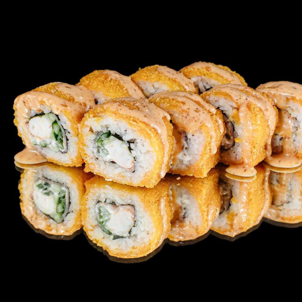 Состав: рис, нори, сыр творожный, бекон, огурец, креветки вареные, соус Шичими, кляр, панировочные сухари