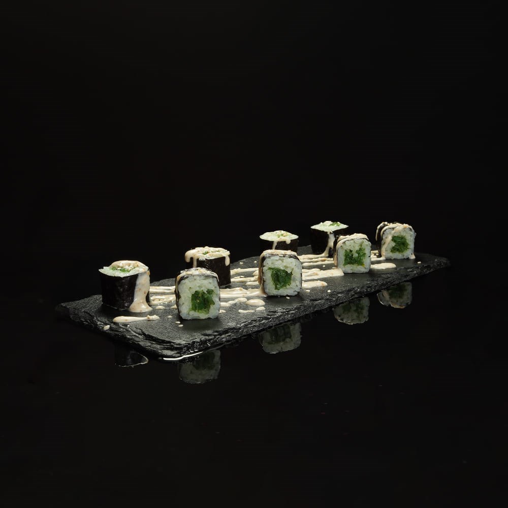 Состав: рис, водоросли нори, салат чука, ореховый соус, кунжут