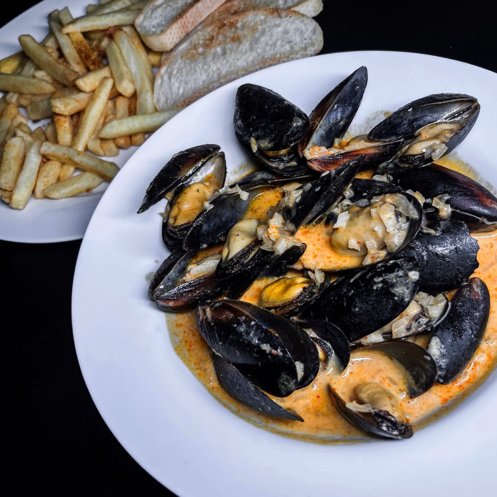 Состав: мидии в панцире, лук репчатый, чеснок свежий, вино белое сухое, паста том ям, молоко, соус бешамель, перец черный молотый, соль, чиабатта , картофель фри