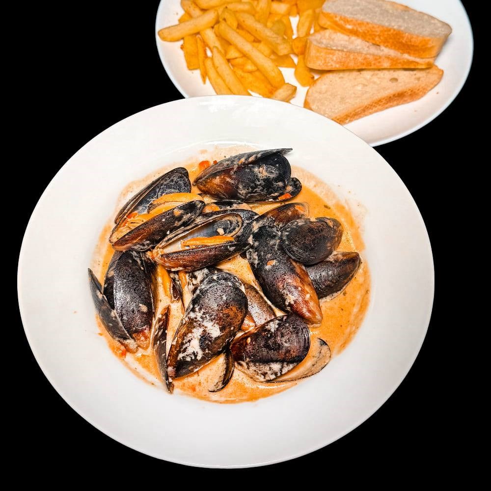 Состав: мидии в панцире, лук репчатый, чеснок свежий, вино белое, соус красный, паста песто, сливки, соль, перец черный, чиабатта, картофель фри