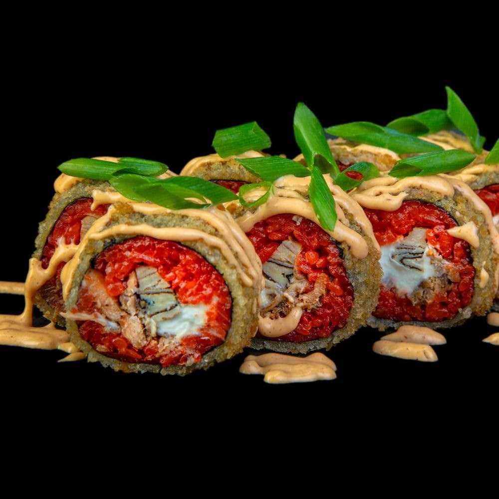 Состав: рис для роллов оранжевый, нори, лосось терияки, сыр творожный, томаго, кляр, сухари панировочные, соус сливочный чили, лук зеленый