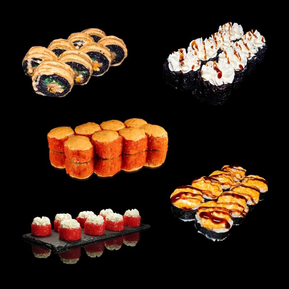 Интрига: рис, нори, копченый лосось, чука, мясо мидий, кляр, сухари панировочные, соус шичими