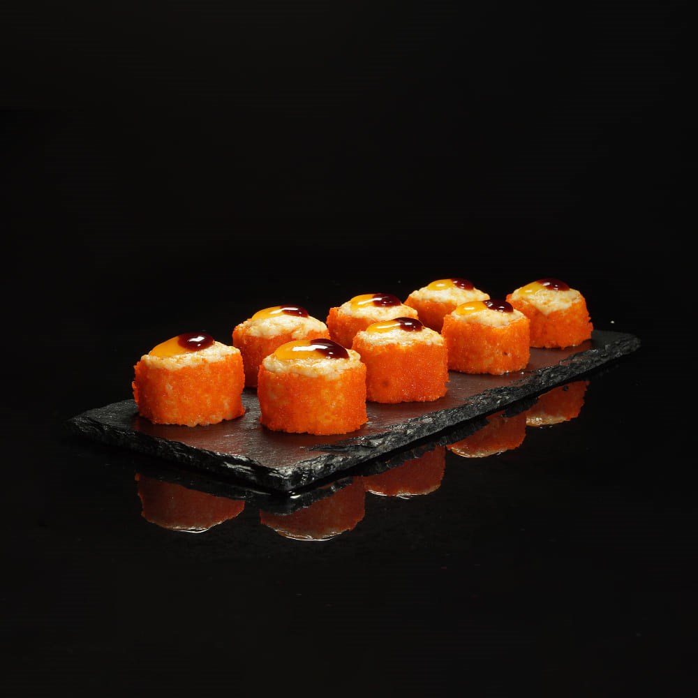 Состав: рис, водоросли нори, сыр творожный, креветка отварная, огурец икра масаго, сырный соус для запекания, соус унаги, соус чили манго