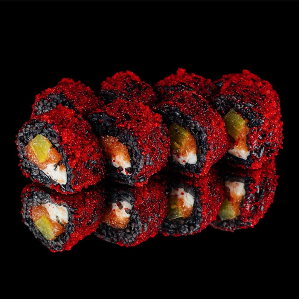 Состав: нори, рис черный, такуан, сыр творожный, лосось тар-тар, масаго