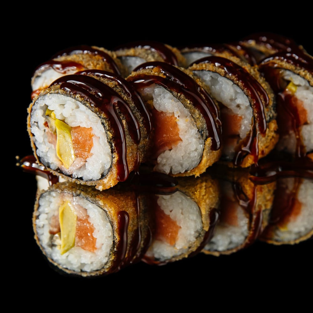 Состав: рис, нори, кларий, лосось филе, бекон, авокадо, соус унаги