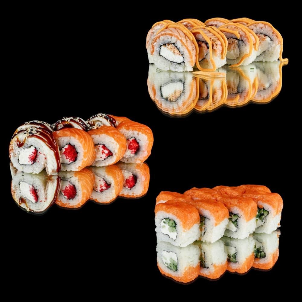 Мидийный: рис, водоросли нори, сыр творожный, томаты, мясо мидий, сырный соус для запекания, соус унаги