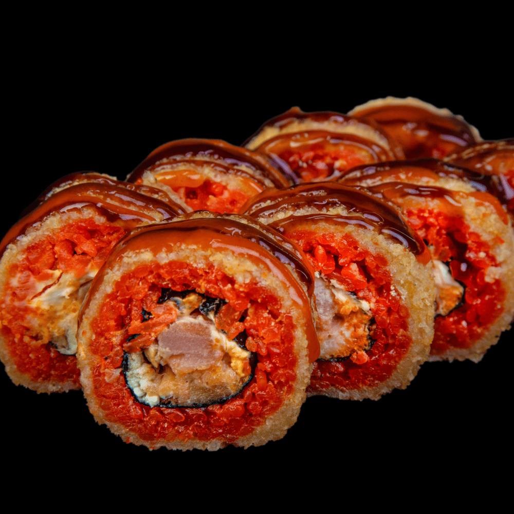 Состав: рис для роллов оранжевый, сыр творожный, нори, лосось филе, угорь, тунец, масаго, кляр, сухари панировочные, соус унаги, соус шрирача