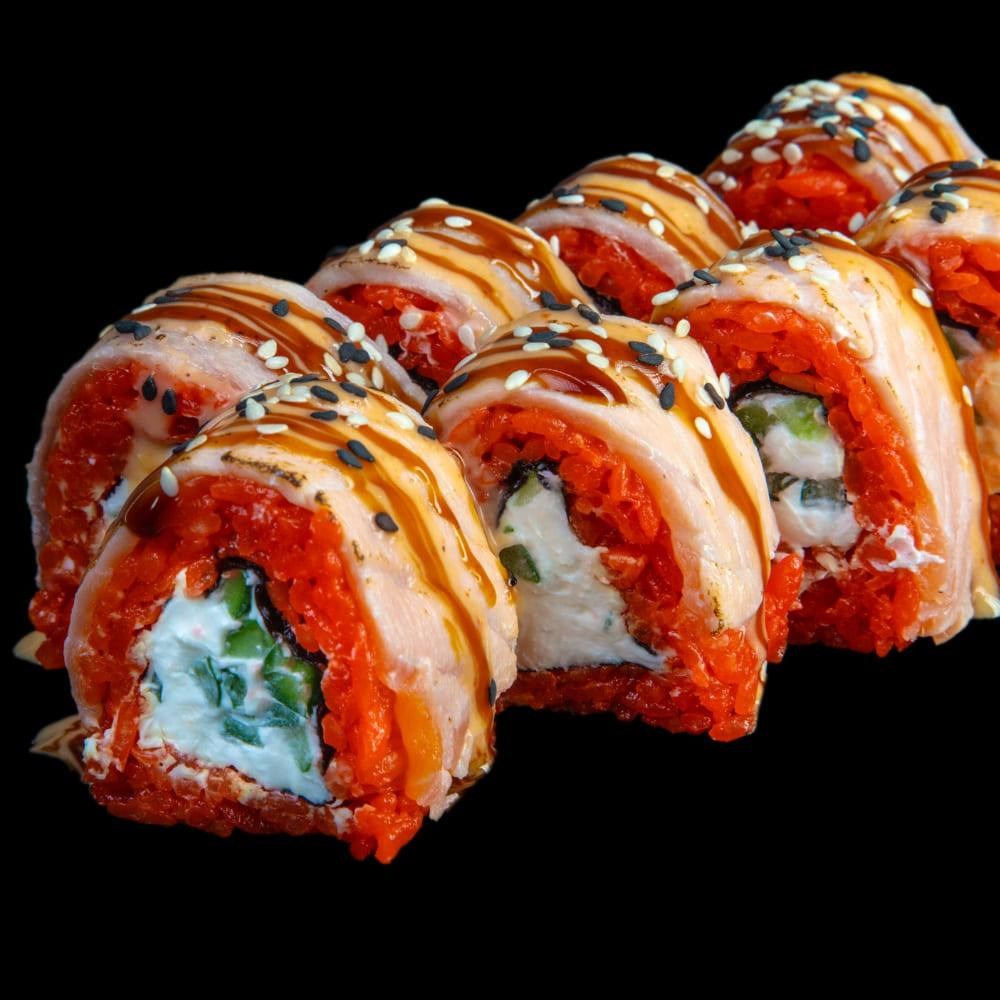 Состав: рис для роллов оранжевый, нори, сыр творожный, огурец, тунец, лосось филе, соус шичими, соус унаги, кунжут черный | белый