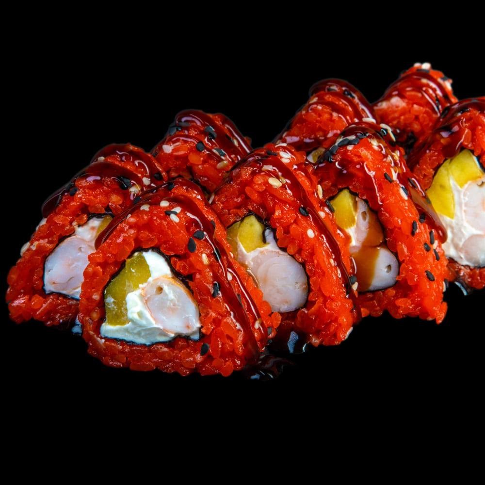 Состав: рис для роллов оранжевый, нори, сыр творожный, манго, креветка отварная, кунжут черный | белый, соус унаги