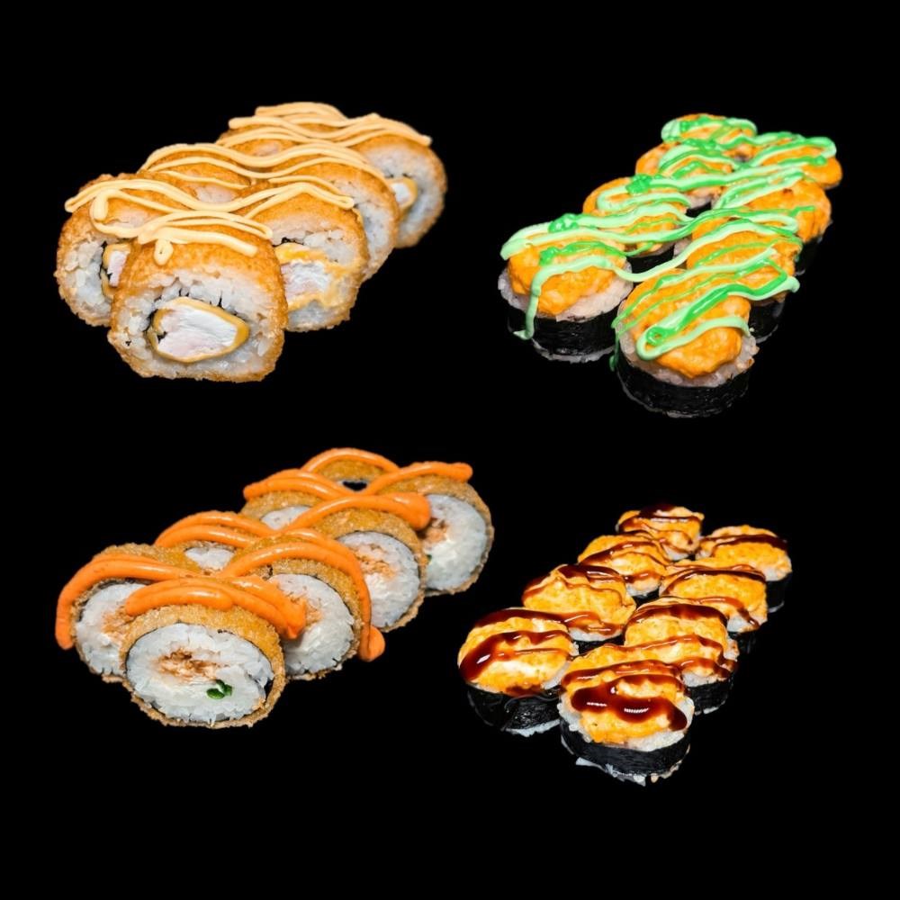 Морской: рис, водоросли нори, сыр творожный, лук зеленый, лосось, тунец, соус кимчи, кляр, сухари панировочные, соус тануки