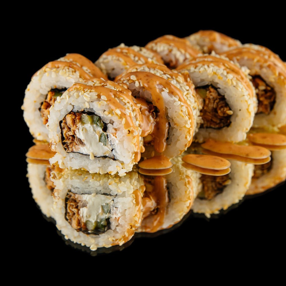 Состав: рис, нори, сыр творожный, лосось терияки, соус кимчи, огурец, кунжут, соус шичими