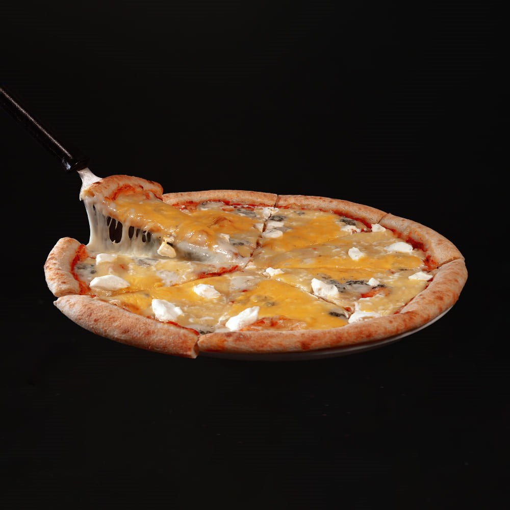 Состав: тесто для пиццы, соус красный, сыр творожный, сыр дор-блю, сыр чеддер, сыр моцарелла
