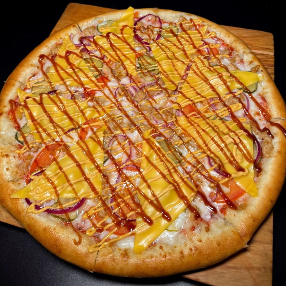Состав: моцарелла, соус красный, фарш куриный п/ф на люля, огурцы сол., томаты, лук красный, сыр.