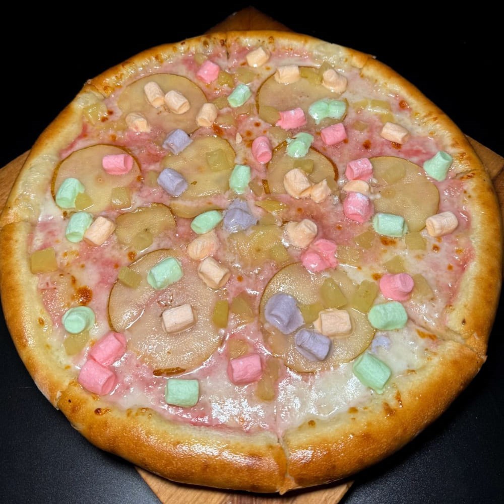 Состав: моцарелла, соус сливочный, топинг клубничный, груша, ананасы, маршмело, сахарная пудра