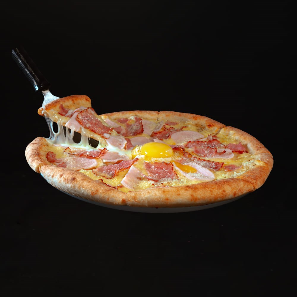 Состав: тесто для пиццы, ветчина, сыр моцарелла, бекон, яйцо куриное, сыр пармезан, белый соус